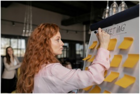 Red-haired woman writing on a whiteboard with sticky notes in a modern office setting.