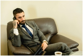 Bearded man in gray suit talking on the phone whil