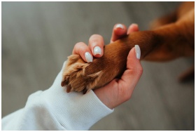 Close-up of a woman's hand holding a dog paw symbolizing trust and companionship.