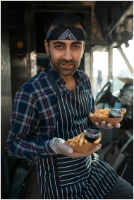 Food truck vendor presenting French fries in a cas