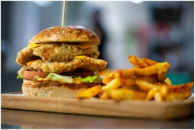 Delicious crispy chicken burger served with french fries on a wooden tray.