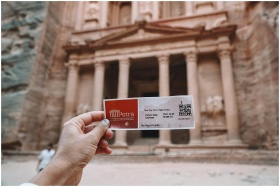 Tourist holding a ticket in front of Al Khazneh temple, Petra, highlighting iconic architectural site.