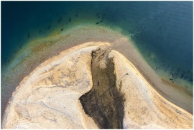 Aerial photo of a lake's shoreline with clear water and sandy beach.