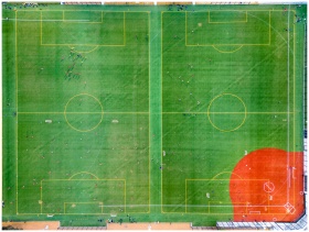 Aerial shot of a vibrant green soccer field with p