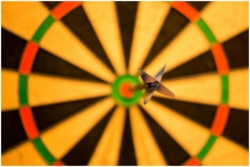 A close-up of a dart perfectly hitting the bullseye on a dartboard, symbolizing accuracy.