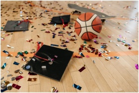 A vibrant scene with graduation caps, a basketball, and confetti on a wooden floor.