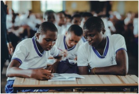 African students concentrating on their studies in a classroom setting, wearing uniforms.