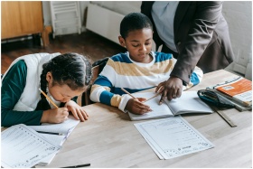 High angle of crop unrecognizable black female teacher explaining task to focused little schoolboy sitting at desk near attentive Asian classmate writing in notebook