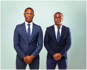 Two professional businessmen posing in formal suits against a neutral backdrop.