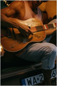 A young man plays a guitar outdoors, sitting by a
