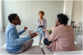 A therapy session featuring a diverse group discussing issues with a mental health professional.