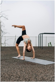 A woman in activewear performing a yoga pose outdoors on a mat.