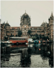 Vibrant scene of Chhatrapati Shivaji Terminus with blurred motion of vehicles and rainy reflections.