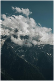 Suspended cable car amidst cloudy mountain peaks, offering a sense of adventure and exploration.