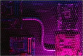 Abstract image of motherboard circuits with a neon