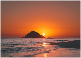 A stunning view of a sunset over Makapu'u Beach, Hawaii, with a silhouetted island and canoe in the foreground.