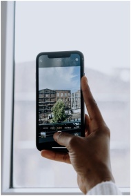 A hand holding a smartphone photographing a city b