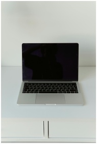 A modern laptop with a blank screen on a minimalis
