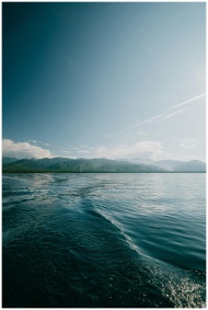 A tranquil seascape featuring calm waters, distant hills, and a clear blue sky.
