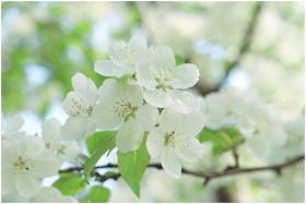 Close-up of delicate white apple blossoms in spring sunshine, showcasing nature's beauty.