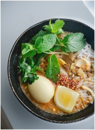 Close-up of a flavorful Asian noodle soup with egg, herbs, and lemon wedge.
