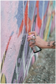 Close-up of a tattooed hand spray painting colorfu