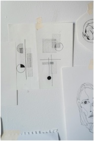 Minimalist abstract drawings and sketches taped to