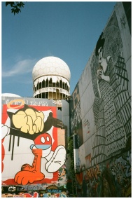Vibrant street art and graffiti adorn the walls of Teufelsberg in Berlin, captured on a sunny day.