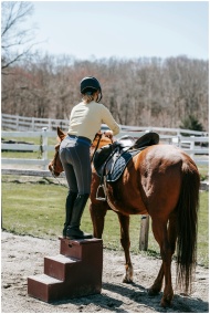 A rider preparing to mount a horse in a sunny outdoor setting.