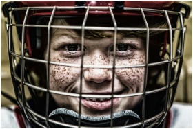 A vibrant close-up of a young ice hockey player smiling confidently with freckles and helmet.