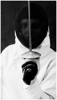 A striking black and white portrait of a fencer in