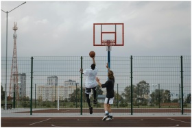 Two adults playing basketball on an outdoor court