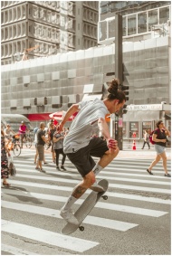 Skateboarder performing a trick on a busy city pedestrian crossing.