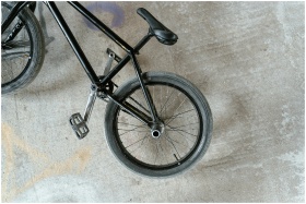 Black BMX bike viewed from above on a concrete surface, showcasing rear wheel and frame details.
