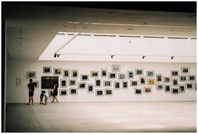 A family exploring an art exhibition in a modern gallery with framed artworks displayed on the wall.