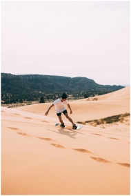 Young person sandboarding on Utah's dunes with sce