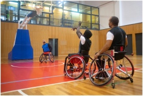 Wheelchair basketball players engaged in a competi