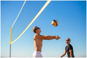 Men playing volleyball on a sunny beach with a cle