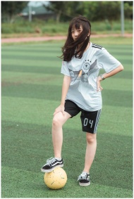 Teen girl in sportswear with a soccer ball on a field, showcasing casual style.