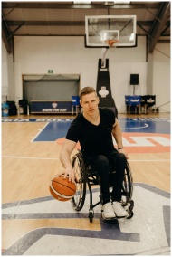 A determined wheelchair basketball player dribblin