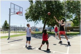 Group of children playing basketball on a sunny outdoor court with trees around.