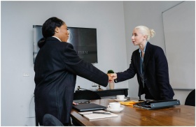Two businesswomen shaking hands in a corporate off