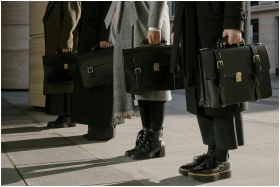 Three professionals stand with leather briefcases, illustrating business style.