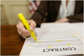 A close-up of a hand highlighting a contract, emph