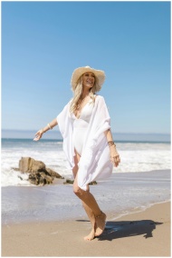 A smiling woman in a sun hat enjoys a walk on a sunny beach wearing a white bikini.