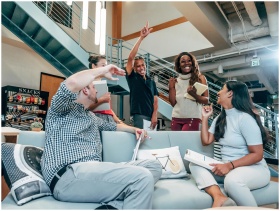 Energetic workplace meeting with diverse team coll