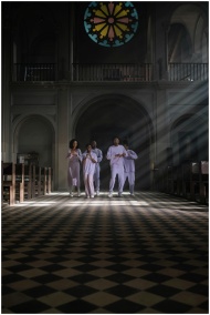 Group of singers in a cathedral with stained glass