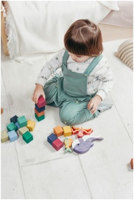 A young child engaged in play with colorful wooden