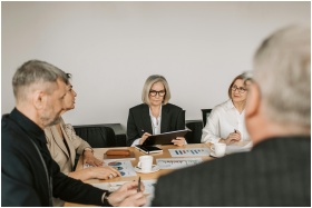 Senior professionals engaged in a collaborative business meeting in a modern office setting.