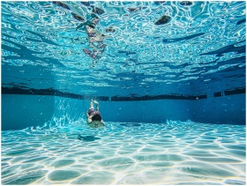 Underwater photo capturing a boy swimming in a clear blue pool, creating ripples.